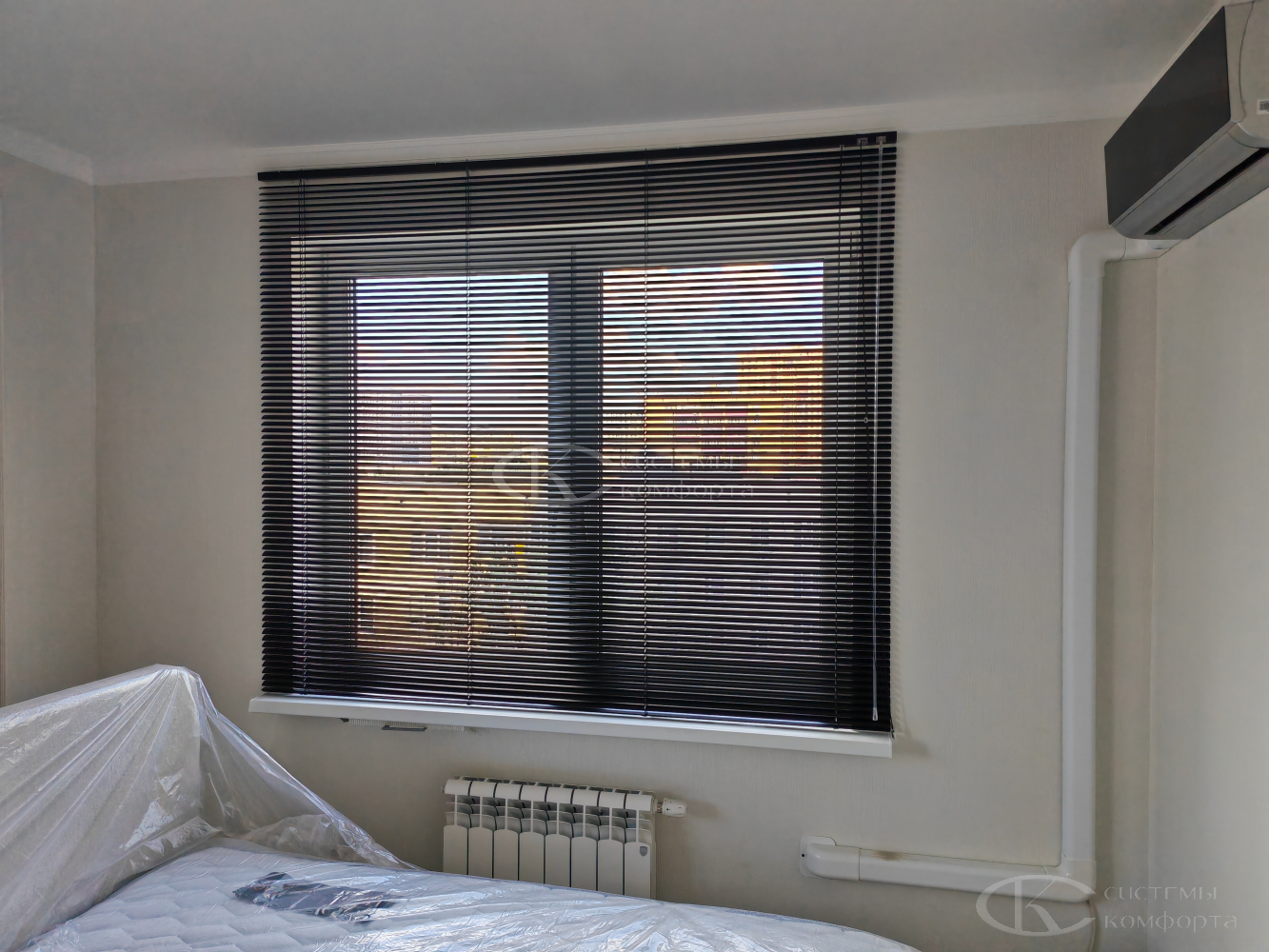 Жалюзи можно собрать полностью или оставить опущенными, но повернуть планки параллельно подоконнику — так свет будет беспрепятственно проникать в помещение.